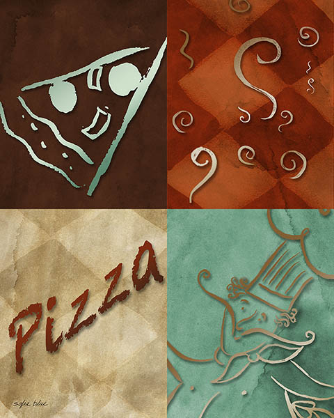 Tags: whimsical, chef, culinary, kitchen, room, orange, illustration, cook, vino, wine, salad, pasta, pizza, restaurant, food, italian, blue